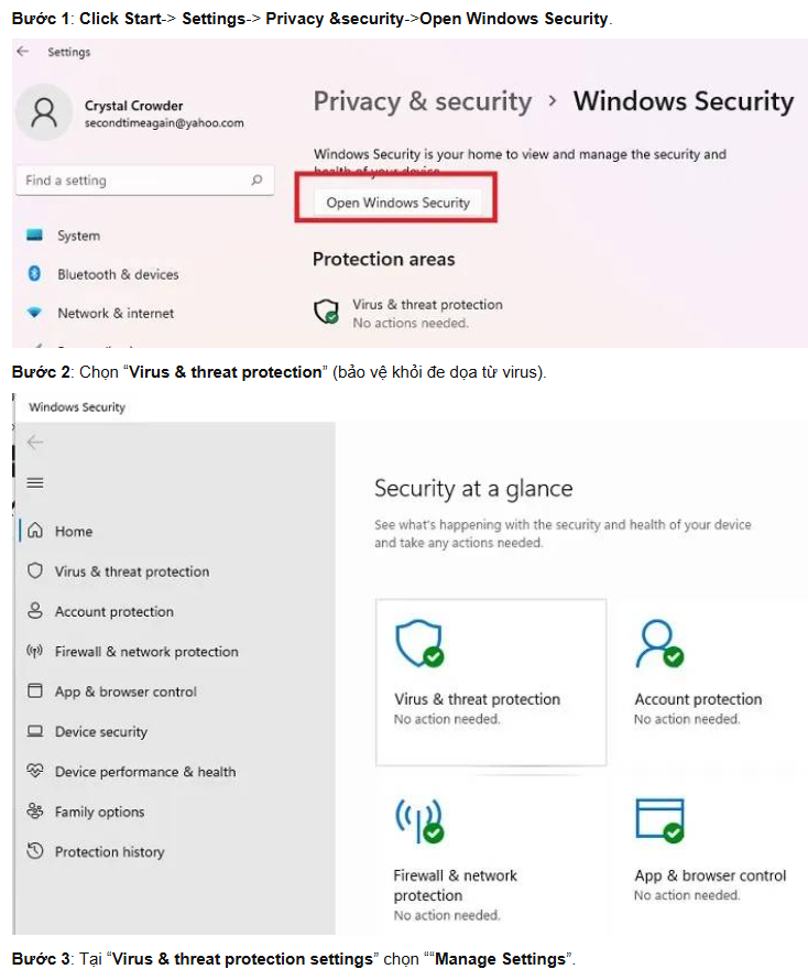 Hãy nhấp chuột vào “Start-> Settings-> Privacy & security” sau đó tùy thuộc vào phiên bản Windows của bạn để chọn “Windows Security” (Bảo mật Windows) hoặc “Windows Defender” (Bảo vệ Windows).