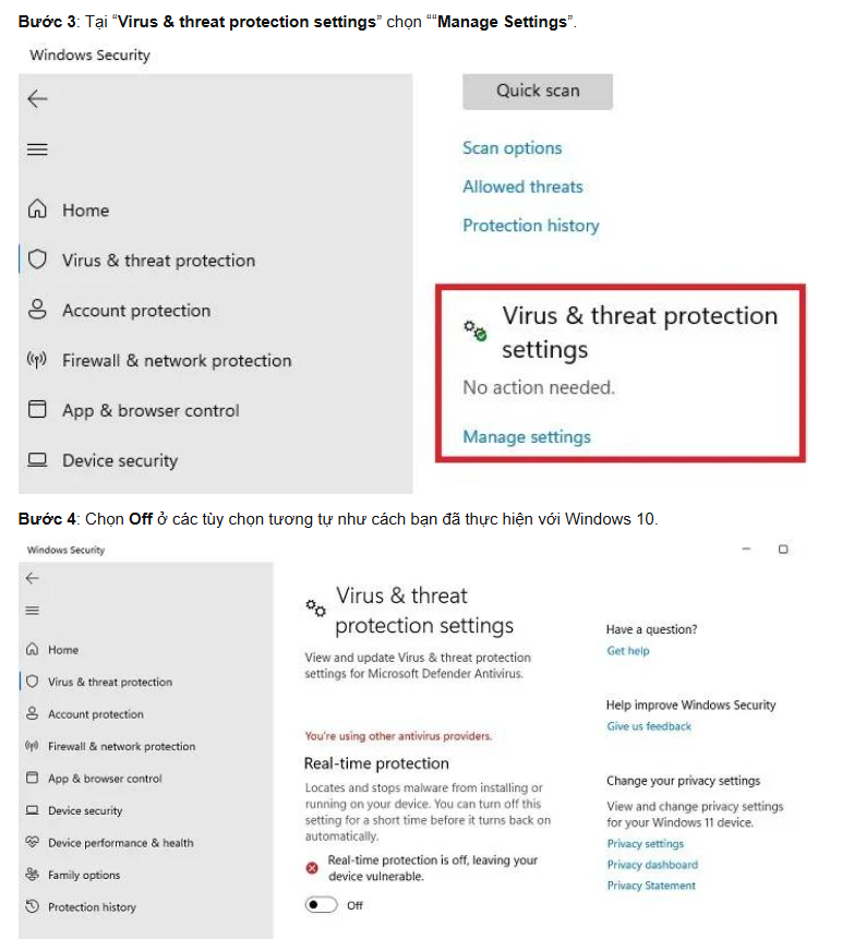 Tắt Real-time protection (tạm thời khi cài)